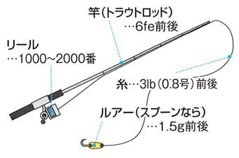 ・ルアー:(スプーン 1g~3g) (プラグ トラウト用クランクベイト・ミノーなど、2cm~7cm)がおすすめです!!