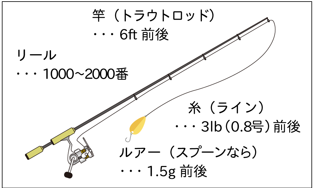 ・ルアー:(スプーン 1g~3g) (プラグ、トラウト用クランクベイト・ミノーなど、2cm~7cm)がおすすめです!!プロショップでお勧めのタックルを購入できます。